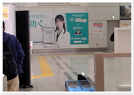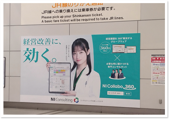 品川駅の新幹線北乗換口を出て真正面の壁面にNI Collabo 360の「経営改善に、効く。」広告がありますので、品川駅で新幹線⇔在来線の乗り換えをする方は、是非「北」乗換口をご利用ください。「南」乗換口もありますのでお間違えにならないようにお願いします。16号車寄り、東京駅寄りの改札です。