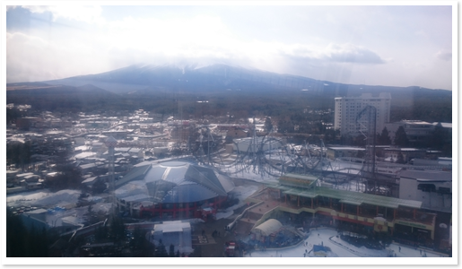 極寒の中グルグル回って疲れたので、次は観覧車に乗った。観覧車と言えば、「ストラテジック・セールス」という営業手法のメインコンセプトなのだが、一度乗ったら途中で降りられないという状況に置かれる。これをあえて体感するために男性社員と2名で搭乗。11分間降りられず。ひたすら密室で耐えなければならない。その観覧車から撮った写真がこちら。あいにく富士山には雲がかかっていたが、さすがに景色は良い。観覧車のゴンドラの中からスマホで撮ったので写真はイマイチだが。