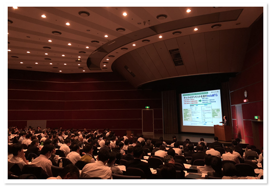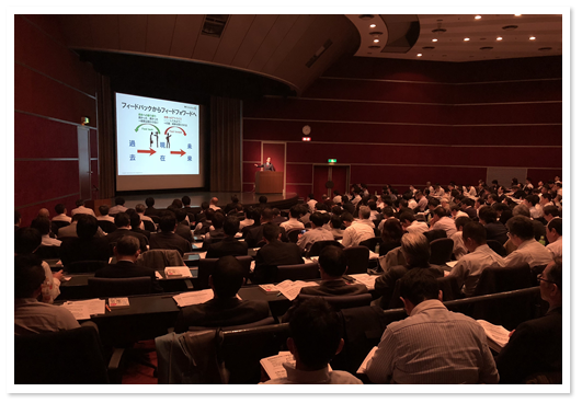 今度は逆側から撮影。こっち側の方が演台がかぶってなくて見やすいな。働き方改革を実現する鍵は、「時間と場所の制約を超える」ことにあるのだが、さらに今回は時間当りの生産性を高めるために「フィードフォワード」という概念をご紹介した。よくある「フィードバック」ではなく「フィードフォワード」。これができるから仕事の質が高まる。